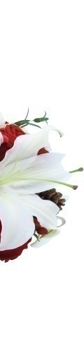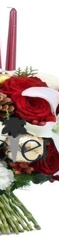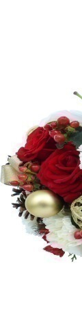 2 White Lilies, 6 Red Roses, 4 White Carnations, 2 White Pompoms, Red Hypericum Berries, 4 Gold Baubles, 1 Pine Cone, 3 Red Candles