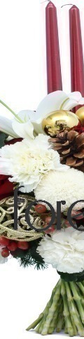 Light up your Silent Night with the Berry Merry Christmas Flower Arrangement. A striking floral gift for the festive season, it includes 2 white lilies, 6 red roses, 4 white carnations, 2 white pompoms, and a sprinkling of red hypericum berries. To give it a real Christmassy feel, we've added 1 pine cone, 4 shimmering gold baubles, and 3 red candles, which will fill any room with warmth, light, and festive merriment this Christmas.